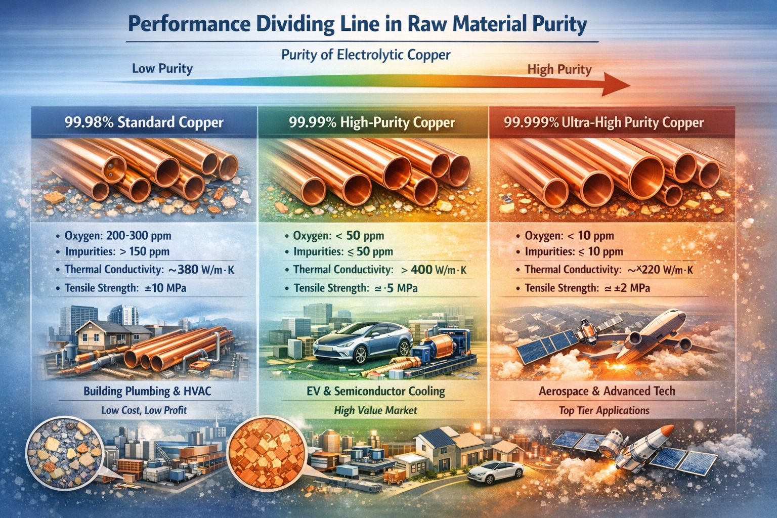 D'fhéadfadh difríocht íonachta de díreach 0.01% a chiallaíonn an difríocht idir na milliúin dollar in orduithe agus leibhéil éagsúla suíomh margaidh. Léiríonn an mionsonra seo atá cosúil leis an loighic lárnach atá taobh thiar de chlaochlú thionscal feadán copair na Síne ó "leathnú scála" go "feabhsú cáilíochta" - tosaíonn an iomaíocht i ndéantúsaíocht ardleibhéil le rialú amhábhar ag an bhfoinse. Na difríochtaí subtle i íonacht amhábhar , méadaithe tríd an bpróiseas táirgthe, ar deireadh thiar a chruthú difríocht mhór in iomaíochas táirgí, a bheith ina bhac dofheicthe do chuideachtaí dul isteach sa mhargadh ard-deireadh.
