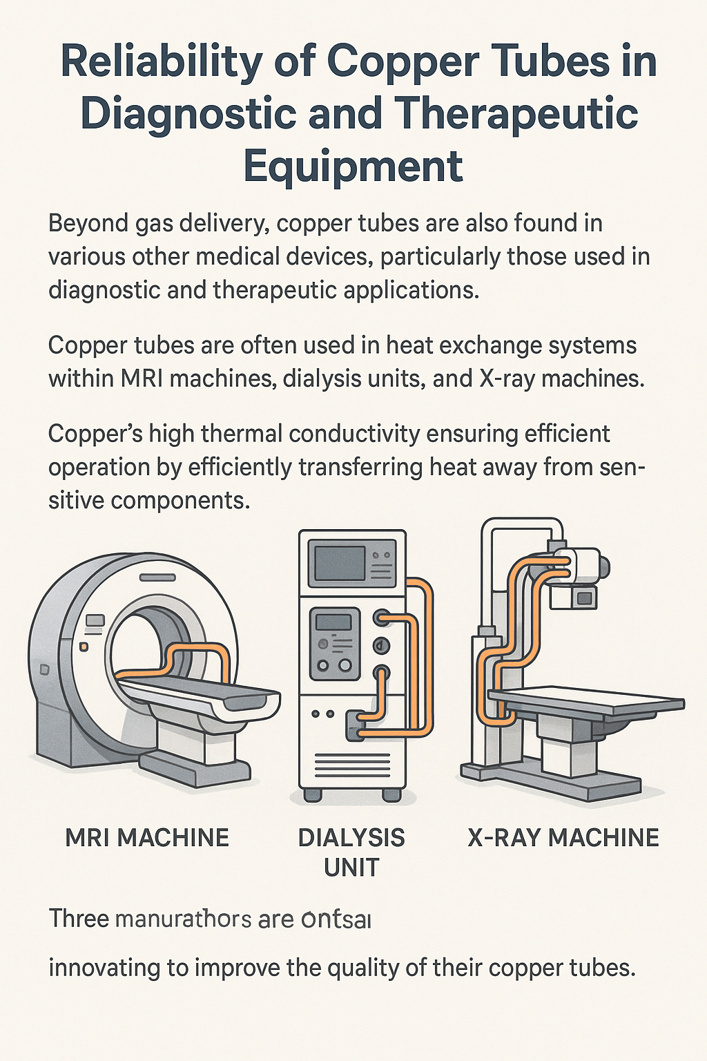 Seachas seachadadh gáis, tá feadáin copair le fáil i bhfeistí leighis éagsúla eile, go háirithe iad siúd a úsáidtear i feidhmchláir dhiagnóiseacha agus theiripeacha . Mar shampla, is minic a úsáidtear feadáin copair i córais malartaithe teasa laistigh de threalamh leighis cosúil le meaisíní MRI, aonaid scagdhealaithe, agus meaisíní X-gha. Cinntíonn seoltacht teirmeach ard copair go n-oibríonn na meaisíní seo go héifeachtach agus go sábháilte trí theas a aistriú go héifeachtach ó chomhpháirteanna íogaire.