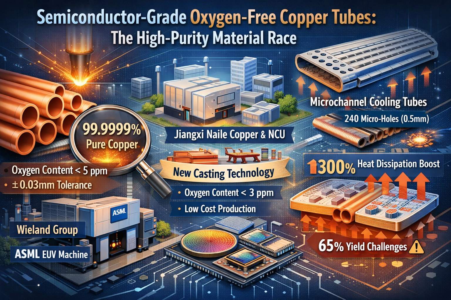 Briseadh isteach cost-éifeachtach tá roghanna eile ag teacht chun cinn. D'fhorbair Jiangxi Naile Copper, i gcomhar le hOllscoil Nanchang, "modh réitigh leanúnach cothrománach scoilte ultra-íseal" a rialaíonn ábhar ocsaigine faoi bhun 3ppm ag aon-ochtú costas modhanna folús allmhairithe. Chuaigh an nuálaíocht seo isteach sa slabhra soláthair do línte táirgeachta 14nm SMIC. I measc na n-iarratas níos forbartha tá feadáin fuaraithe ar leibhéal wafer le dearaí micreachainéil (m.sh., 240 micrea-poll trastomhas 0.5mm) chun éifeachtacht diomailt teasa a fheabhsú 300%, cé go bhfuil rátaí toraidh fós ina dhúshlán ag 65%.