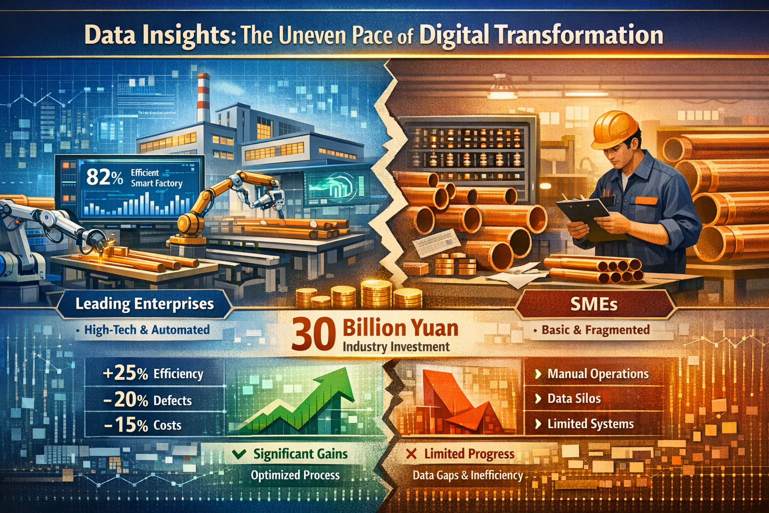 Mar sin féin, níl an infheistíocht agus na torthaí comhréireach, agus léiríonn claochlú digiteach an tionscail a difríocht shoiléir . Tá torthaí suntasacha bainte amach ag cuideachtaí ceannais, lena bpleanáil straitéiseach beacht agus lena n-acmhainní cuimsithí, maidir le claochlú digiteach. Trí bhainistíocht dhigiteach lánphróisis, mhéadaigh siad éifeachtacht táirgthe 25% -30% ar an meán, laghdaigh rátaí lochtanna táirgí 15% -20%, laghdaigh timthriallta seachadta orduithe 20% -25%, agus laghdaigh siad costais iomlána 10% -15%. I gcodarsnacht lom, tá an claochlú digiteach ar mhonaróirí beaga agus meánmhéide den chuid is mó fós ag an mbunleibhéal. Níl ach bainistíocht ar líne bainte amach ag níos mó ná 60% de na cuideachtaí seo ar ghnéithe mar airgeadas, fardal, agus orduithe, agus tá próisis táirgthe fós ag brath go príomha ar oibriú láimhe agus breithiúnas bunaithe ar thaithí. Níl sna córais dhigiteacha anois " mórleabhair leictreonacha ,” teip feabhas a chur ar éifeachtúlacht agus ina ionad sin costais oibriúcháin a mhéadú mar gheall ar chothabháil an chórais agus oiliúint pearsanra. Thuairiscigh beagnach 30% d’fhiontair bheaga agus mheánmhéide go raibh a n-infheistíocht dhigiteach “ ní fiú an costas ."