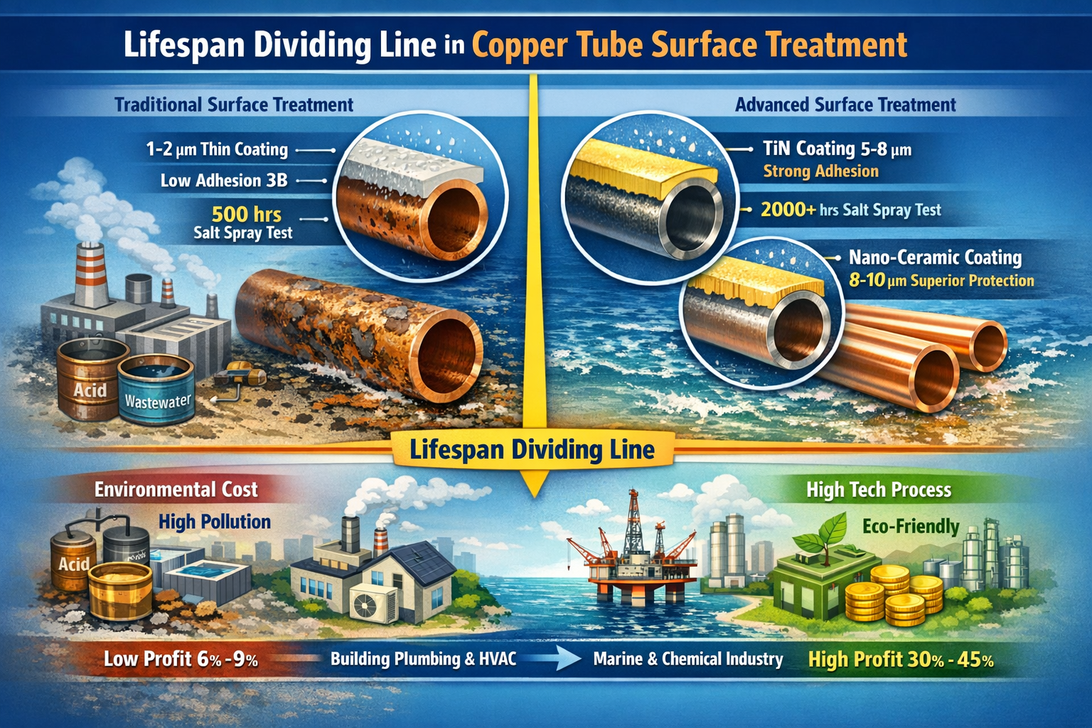 Is é an luach lárnach a bhaineann le cóireáil dromchla an fheadáin chopair ná ciseal cosanta a fhoirmiú ar an dromchla trí mhodhanna fisiceacha nó ceimiceacha, é a leithlisiú ó fhoinsí creimneach mar aer, taise, agus meáin aigéad-bun, agus ag an am céanna ag barrfheabhsú garbh an dromchla agus ag feabhsú comhoiriúnacht táirgí. Athraíonn na sraitheanna cosanta arna bhfoirmiú ag próisis éagsúla go mór i aonfhoirmeacht tiús, greamaitheacht, agus friotaíocht creimeadh , tionchar díreach ar deireadh thiar saolré an táirge. Léiríonn sonraí ó thástálacha luathaithe aosaithe a rinne Cumann Tionscal Próiseála Miotail Neamhfheiriúla na Síne: Feadáin copair a úsáideann an próiseas traidisiúnta picilte agus pasivation bhfuil tiús ciseal cosanta ach 1-2 μm, rátáil greamaitheachta 3B (go héasca scoite), agus saol tástála creimeadh luathaithe de thart ar 500 uair an chloig i dtimpeallacht uisce salann 5%, a fhreagraíonn do shaol seirbhíse iarbhír 3-5 bliana; Feadáin copair ag baint úsáide as an próiseas plating ian bhfolús (sciath TiN). tá tiús ciseal cosanta de 5-8 μm acu, rátáil greamaitheachta 1B (greamaitheacht láidir), agus saol tástála níos mó ná 2000 uair an chloig sa timpeallacht uisce salann céanna, le saol seirbhíse iarbhír níos mó ná 15 bliana; agus feadáin copair ag baint úsáide as an snasta leictriceimiceach próiseas sciath nanoceramic feidhmíocht chosanta níos fearr fós a thairiscint, le saol seirbhíse iarbhír níos mó ná 20 bliain, oiriúnach go foirfe do thimpeallachtaí ceimiceacha an-chreimneach.