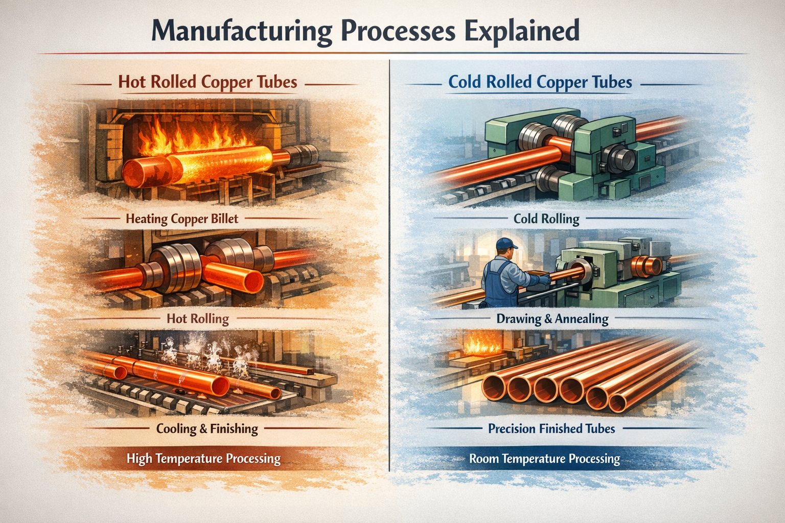 Is comhpháirteanna riachtanacha iad feadáin chopair i dtionscail mar HVAC&R, cuisniú, leictreonaic, pluiméireacht, déantúsaíocht feithicleach, agus trealamh tionsclaíoch. De réir mar a leanann an t-éileamh domhagusa ar ábhair éifeachtacha iontaofa ag fás, oibríonn go leor ceannaitheoirí go dlúth le gairmí monarcha feadán copair chun táirgí a chomhlíonann ceanglais theicniúla agus iarratais ar leith a roghnú. I measc na roghanna is coitianta, feadán copair fuar-rollta and feadán copair te-rollta difríocht shuntasach i bhfeidhmíocht, próiseáil, agus oiriúnacht.