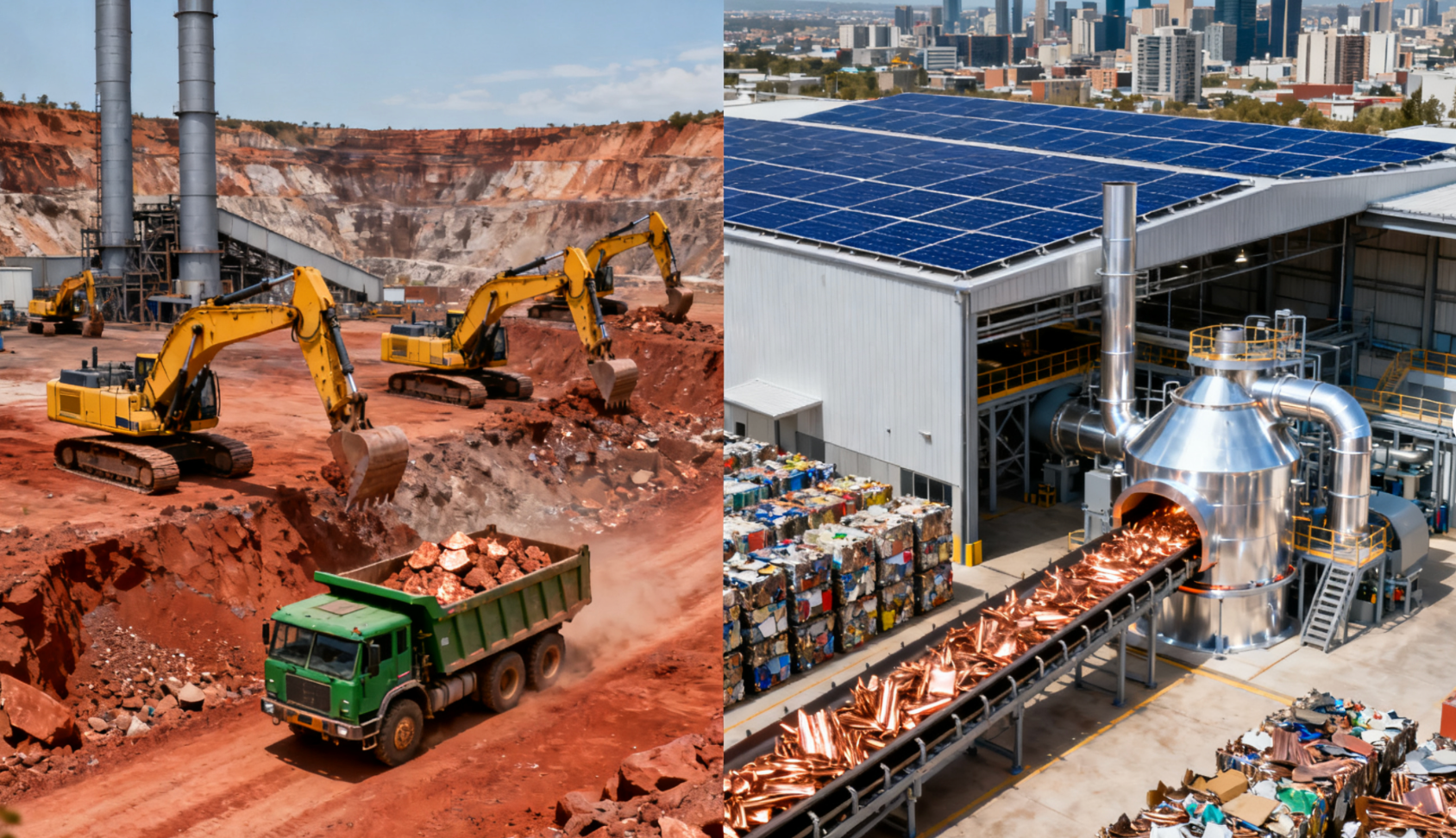 (Fotheideal: An déchosaint bhunúsach: Léiríonn eastóscadh acmhainní (geilleagar líneach) i gcomparáid le hathghiniúint acmhainní (geilleagar ciorclach) físeanna contrártha do thodhchaí táirgeadh feadán copair.)