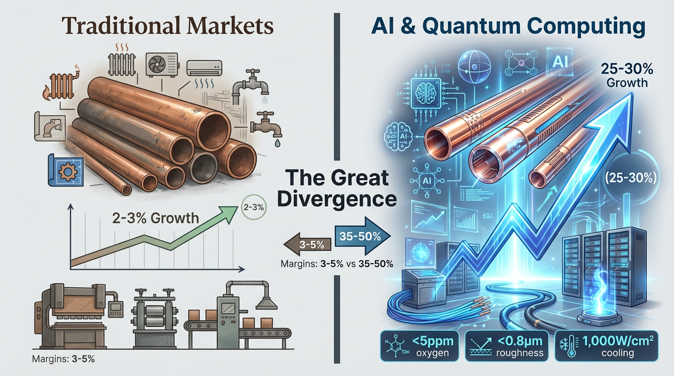 An domhanda feadán copair tá ilroinnt gan fasach ag an tionscal. Cé go tógála traidisiúnta and Feidhmchláir HVAC fás ag 2-3% measartha go bliantúil, éileamh feadáin beachtais i ndéantúsaíocht leathsheoltóra, tá bonneagar AI, agus ríomhaireacht chandamach ag ardú ag 25-30% in aghaidh na bliana. Cruthaíonn an éagsúlacht seo margadh dhá shraith: bíonn mór-tháirgeoirí ag streachailt le héarlaisí 3-5%, agus bíonn ollchorrlaigh de 35-50% ag monaróirí speisialaithe i gcás feadáin a shásaíonn sonraíochtaí foircneacha.