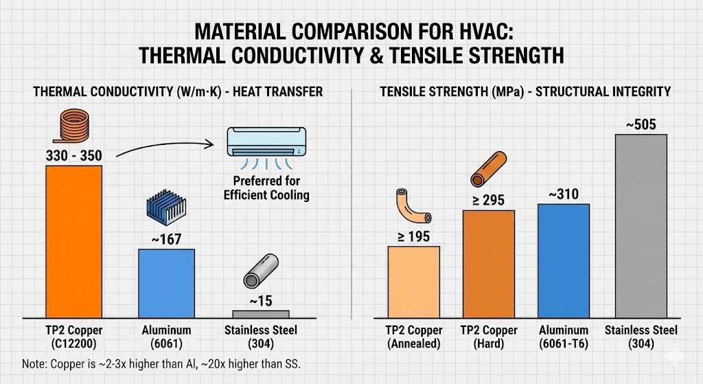 Cibé an sna haonaid aerchóirithe a choinníonn ár dtithe compordach, an pluiméireacht a sheachadann uisce sábháilte, nó na córais fuaraithe sa chéad ghlúin eile de fheithiclí leictreacha, is é TP2 an t-ábhar bunúsach do bhainistíocht teirmeach agus sreabhán nua-aimseartha. Agus ábhar á roghnú le haghaidh iarratais ard-bhrú, ardteochta nó ard-éifeachtúlachta, seasann TP2 (C12200) mar thagarmharc cruthaithe an tionscail.