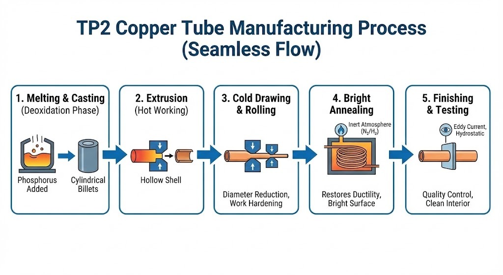 Is turas é táirgeadh feadáin copair TP2 ó bhruithniú ardteasa go fuar-obair ardchruinneas. Táirgtear an chuid is mó feadáin TP2 préimhe mar feadáin gan uaim , rud a chuireann deireadh leis an mbaol teip weld-seam.