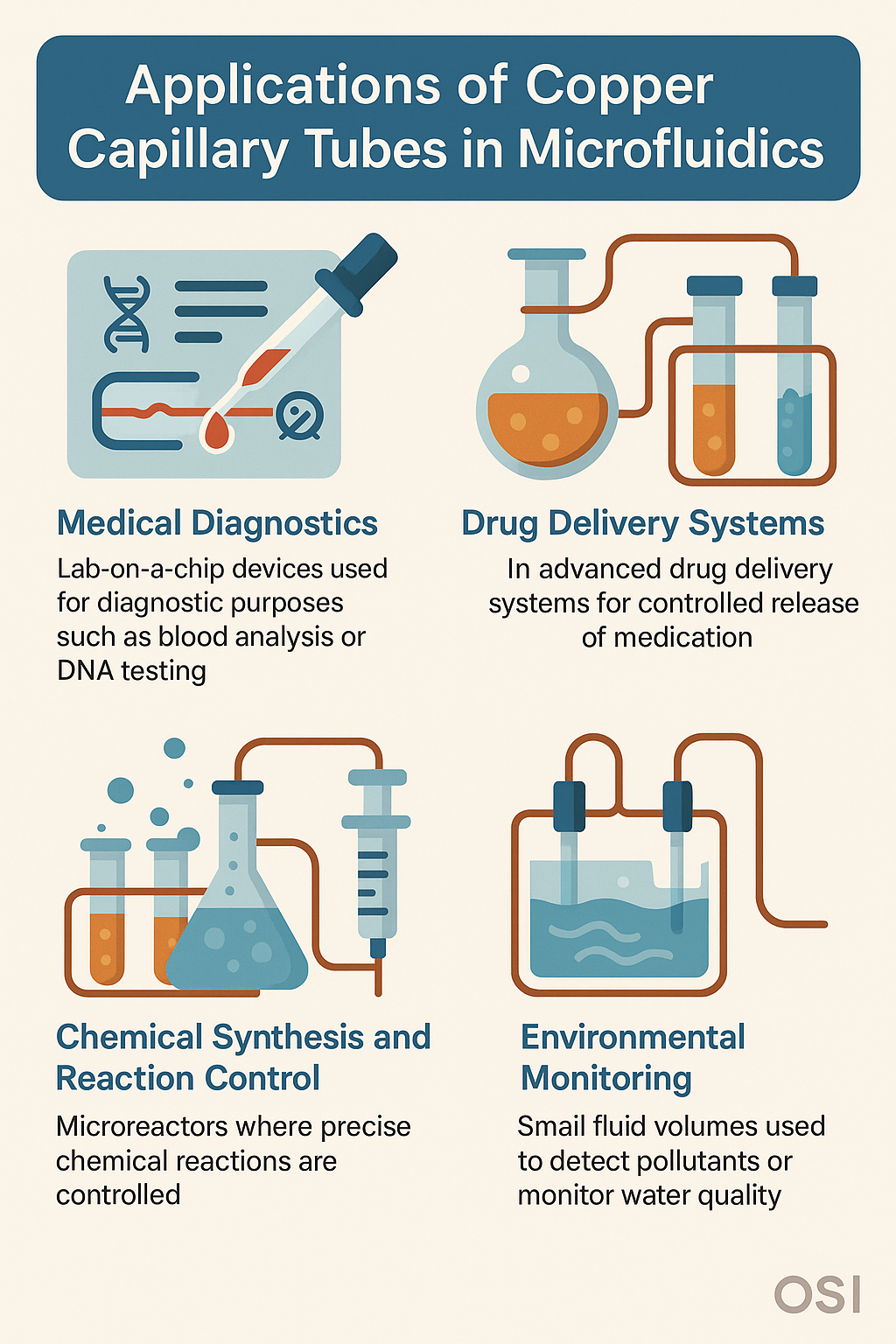 Lab-ar-a-sliseanna teastaíonn rialú beachta ar sreabhán le haghaidh feistí a úsáidtear chun críocha diagnóiseacha amhail anailís fola nó tástáil DNA. Feadáin ribeach copair oiriúnach do na gléasanna seo, mar go gcabhraíonn siad le sreabháin a sheachadadh chuig criosanna imoibrithe agus rialú teochta á gcoimeád ar bun acu. Cinntíonn airíonna frithmhiocróbach copair freisin go bhfanann an córas steiriúil, rud a chosc ar éilliú a d'fhéadfadh tionchar a bheith aige ar chruinneas na dtorthaí.