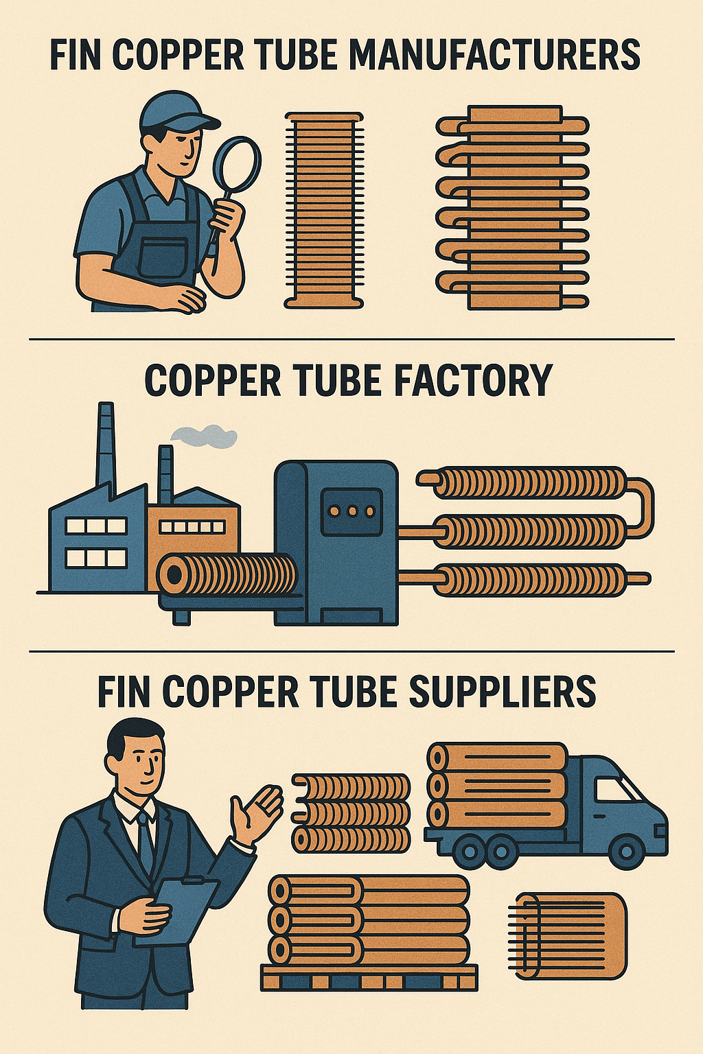 Déantóirí Feadáin Copar Fin freagrach as feadáin copair ardchaighdeáin a tháirgeadh atá deartha go sonrach le haghaidh feidhmeanna malartaithe teasa. Oibríonn na monaróirí seo le teicnící táirgthe chun cinn chun feadáin a chruthú atá buan, éifeachtach agus cost-éifeachtach. Tá a ról sa slabhra soláthair ríthábhachtach, toisc go gcinntíonn siad go gcomhlíonann na hábhair caighdeáin tionscail agus sonraíochtaí custaiméirí.