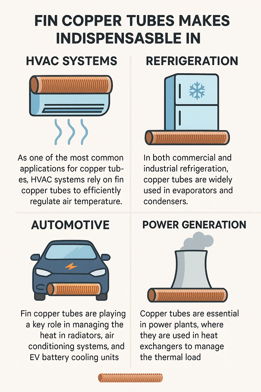 Giniúint Cumhachta : Déanann seoltacht teirmeach ard copair freisin feadáin copair riachtanach i stáisiúin chumhachta, áit a n-úsáidtear iad i malartóirí teasa chun an t-ualach teirmeach i dtuirbíní gaile agus túir fuaraithe a bhainistiú. Marthanacht agus éifeachtúlacht feadáin chopair eite a chinntiú go n-oibríonn na córais seo ag an bhfeidhmíocht optamach ar feadh tréimhsí fada.