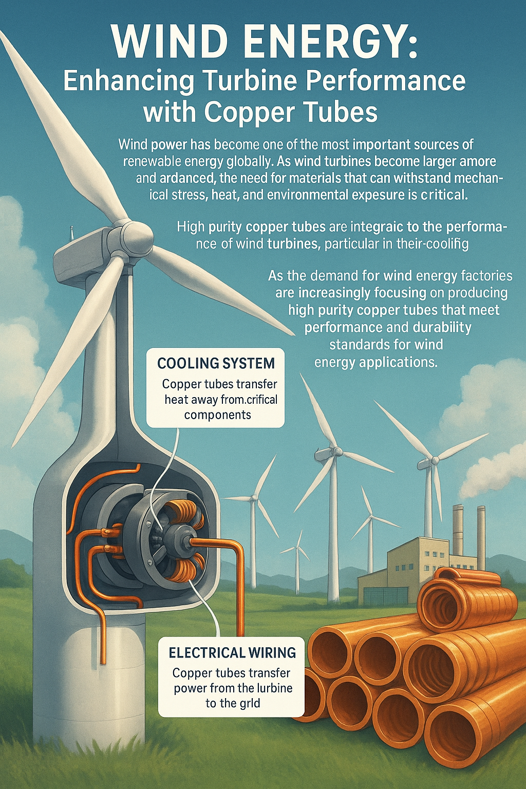 Tá cumhacht gaoithe anois ar cheann de na foinsí fuinnimh in-athnuaite is tábhachtaí ar domhan. De réir mar a éiríonn tuirbíní gaoithe níos mó agus níos forásaí, tá an gá le hábhair atá in ann strus meicniúil, teas agus nochtadh comhshaoil a sheasamh ríthábhachtach. Feadáin copair íonachta ard atá lárnach d'fheidhmíocht na tuirbíní gaoithe , go háirithe i gcuid córais fuaraithe agus electrical components.