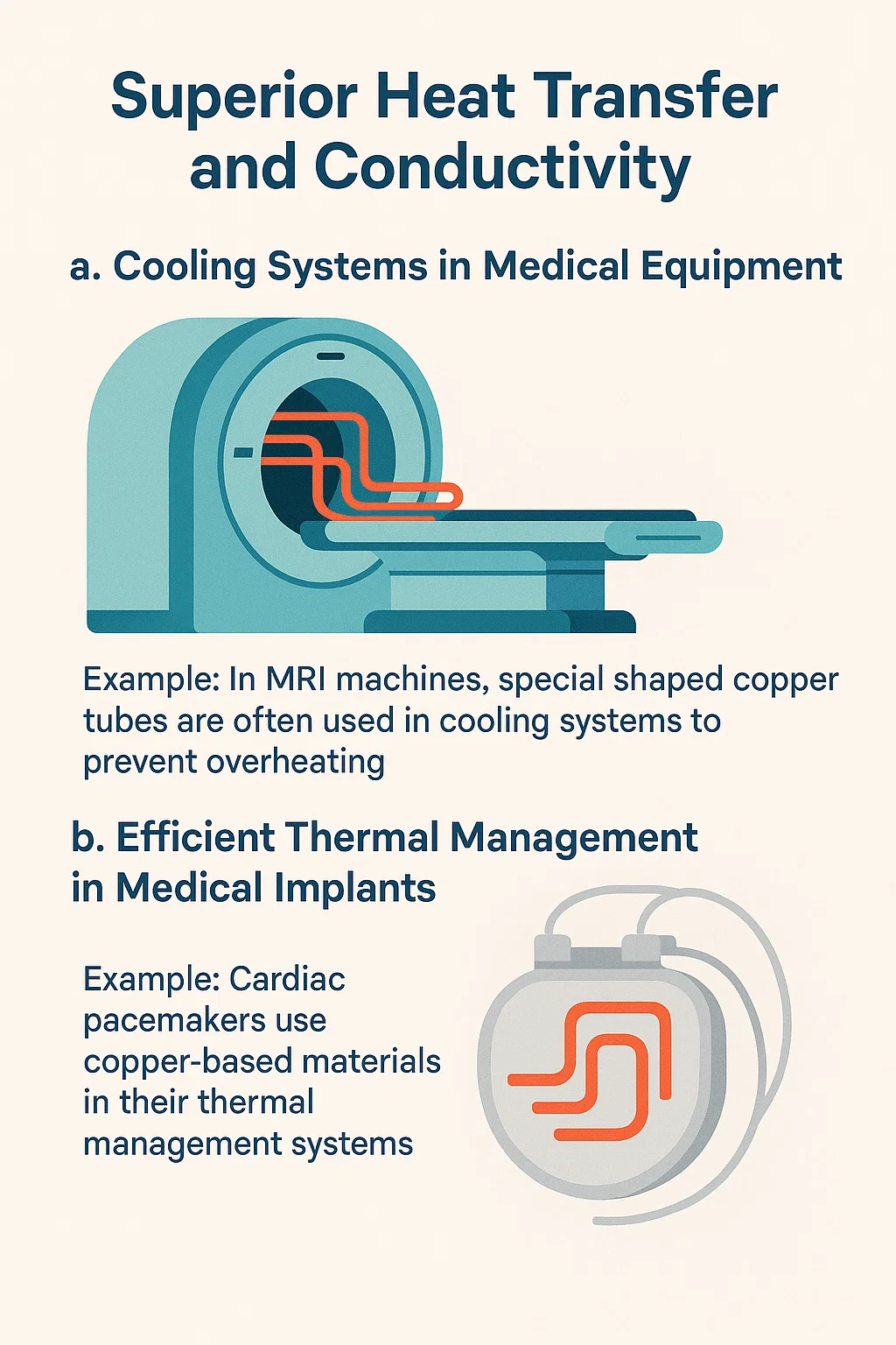 Go leor feistí leighis, mar mheaisíní MRI, Scanóirí CT , agus léasair máinliachta , a ghiniúint méideanna suntasacha teasa le linn oibriú. Úsáidtear feadáin copair, go háirithe iad siúd a bhfuil cruthanna speisialaithe acu teas a scaipeadh go héifeachtach, ag cinntiú go bhfanann na feistí fionnuar agus ag feidhmiú ar feadh tréimhsí fada.