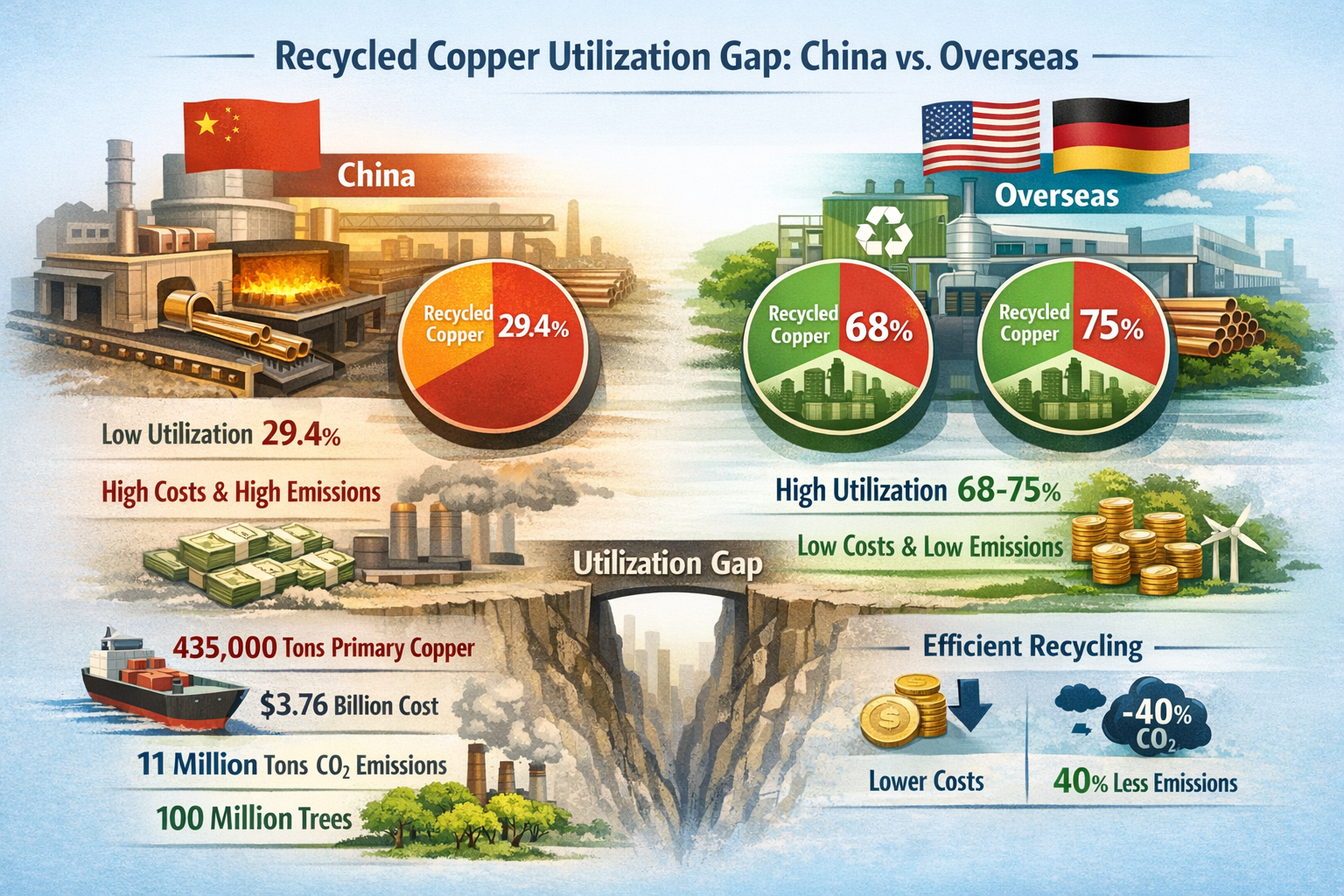 I gcodarsnacht lom, léiríonn cuideachtaí thar lear cumais athchúrsála an-éifeachtach . Tá ráta úsáide copair athchúrsáilte de 68% ag Mueller Industries, príomh-mhonaróir feadáin copair sna Stáit Aontaithe. Bhí a gcuid foirgneamh agus aer riochtú déantar feadáin copair go príomha as copar athchúrsáilte, agus trí leas iomlán a bhaint as próiseas beacht agus rialú comhdhéanamh, tá cáilíocht an táirge do-aitheanta ó tháirgí déanta as copar maighdean. Mhéadaigh Grúpa KME na Gearmáine a ráta úsáide copair athchúrsáilte go 75%, ag baint úsáide as córas sofaisticiúil sórtála agus athchúrsála dramh-copair na hEorpa chun timthriall lúb dúnta a bhaint amach " dramh-athchúrsáil copair - sórtáil beacht - leá agus scagadh - táirgeadh feadán copair ." Mar thoradh air seo tá costasas táirgthe in aghaidh an tonna de fheadáin chopair 1800-2200 yuan níos ísle ná sin de chuid cuideachtaí na Síne, agus déine astaithe carbóin nach bhfuil ach 40% de na cuideachtaí Síneacha.